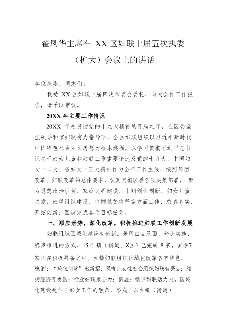 / 翟凤华主席在XX区妇联十届五次执委(扩大)会议上的讲话