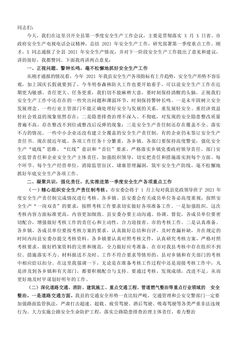/ (1.9)副县长在全县安全生产工作暨防范生产安全事故会议上的讲话