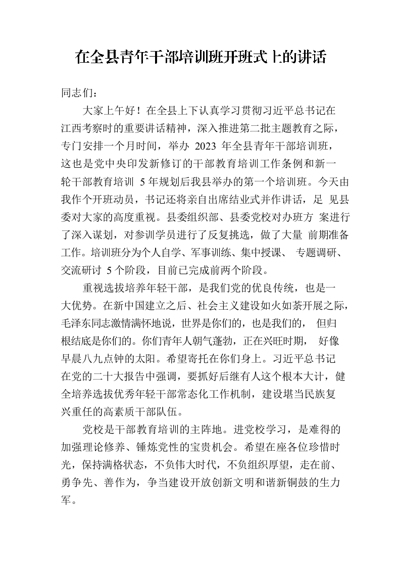 / (10.21)2023年全县青年干部培训班开班式讲话稿
