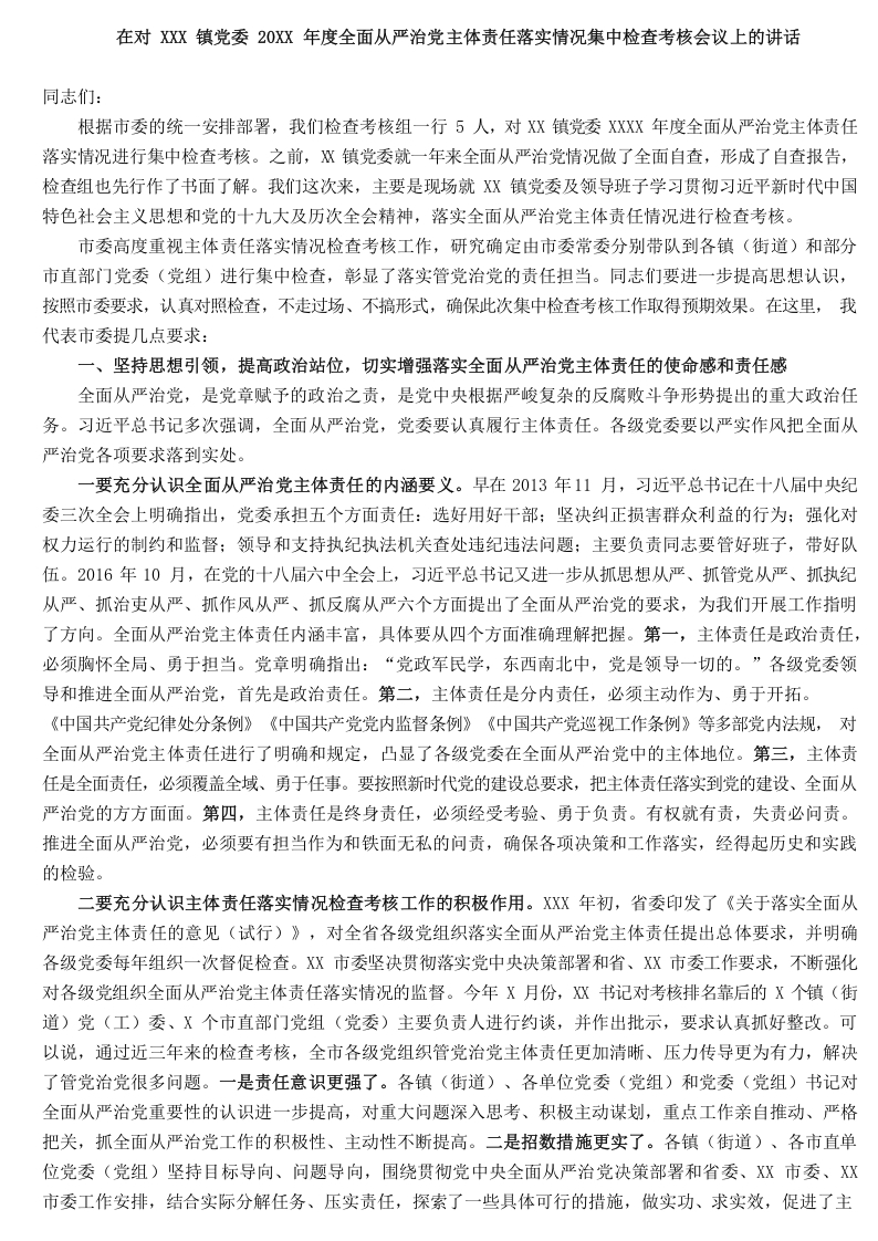 / (11.10)在对XXX镇党委20XX年度全面从严治党主体责任落实情况集中检查考核会议上的讲话