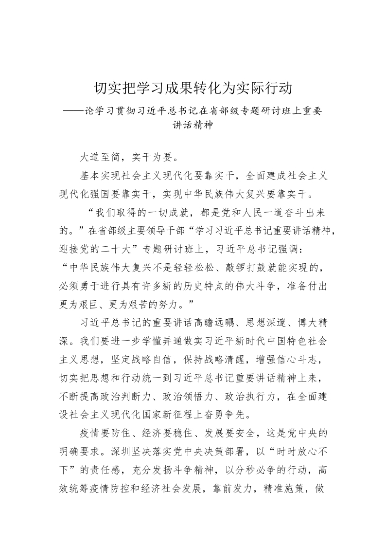 (20220808)切实把学习成果转化为实际行动——论学习贯彻习近平总书记在省部级专题研讨班上重要讲话精神