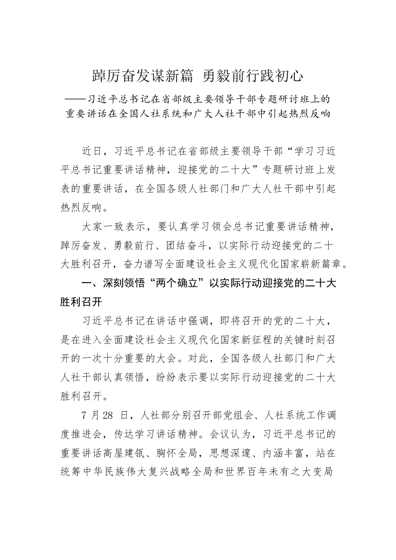 (20220808)踔厉奋发谋新篇 勇毅前行践初心——习近平总书记在省部级主要领导干部专题研讨班上的重要讲话在全国人社系统和广大人社干部中引起热烈反响