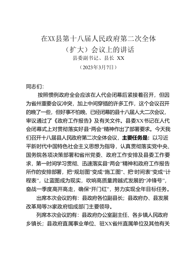 / (20230307)县长在XX县第十八届人民政府第二次全体会议上的讲话