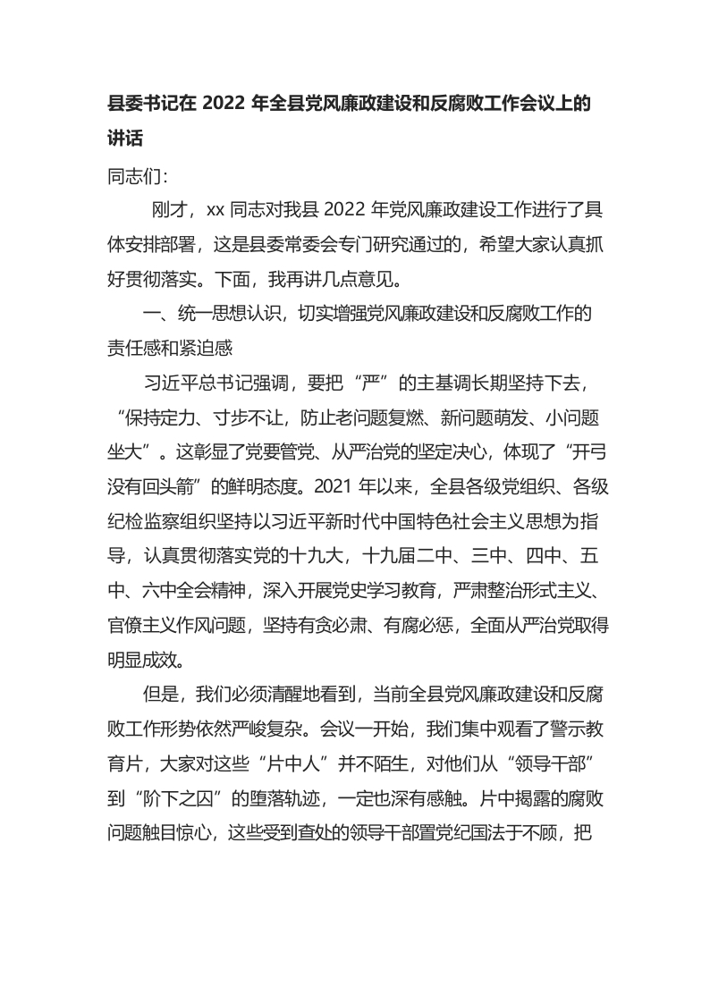 / (3.16)县委书记在2022年全县党风廉政建设和反腐败工作会议上的讲话
