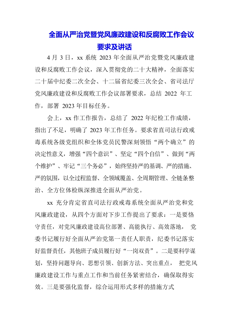 (3篇)党风廉政建设暨从严治党会议讲话材料及心得体会