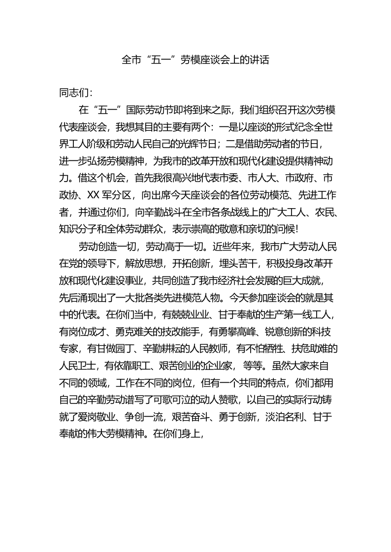/ (4.19)全市“五一”劳模座谈会上的讲话