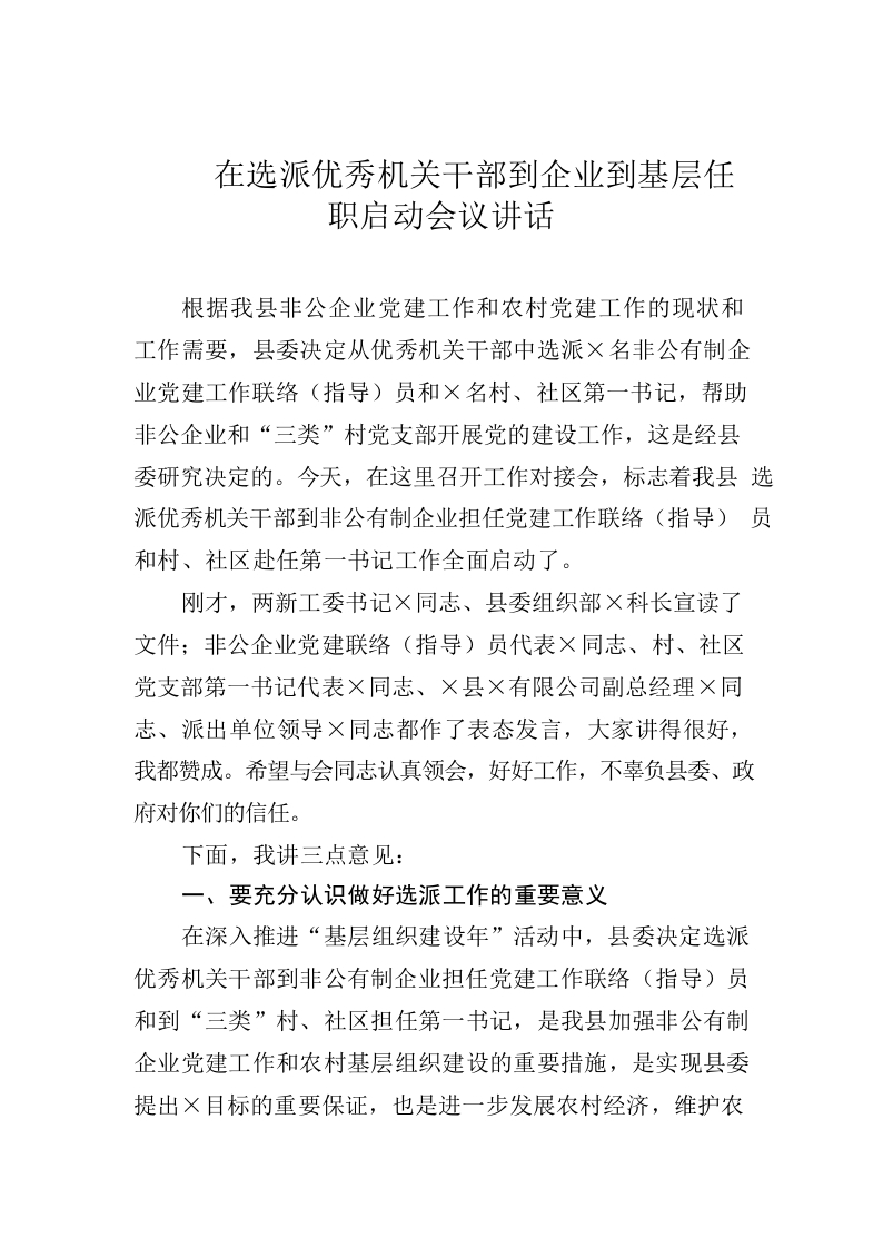 / (7.14)在选派优秀机关干部到企业到基层任职启动会议讲话