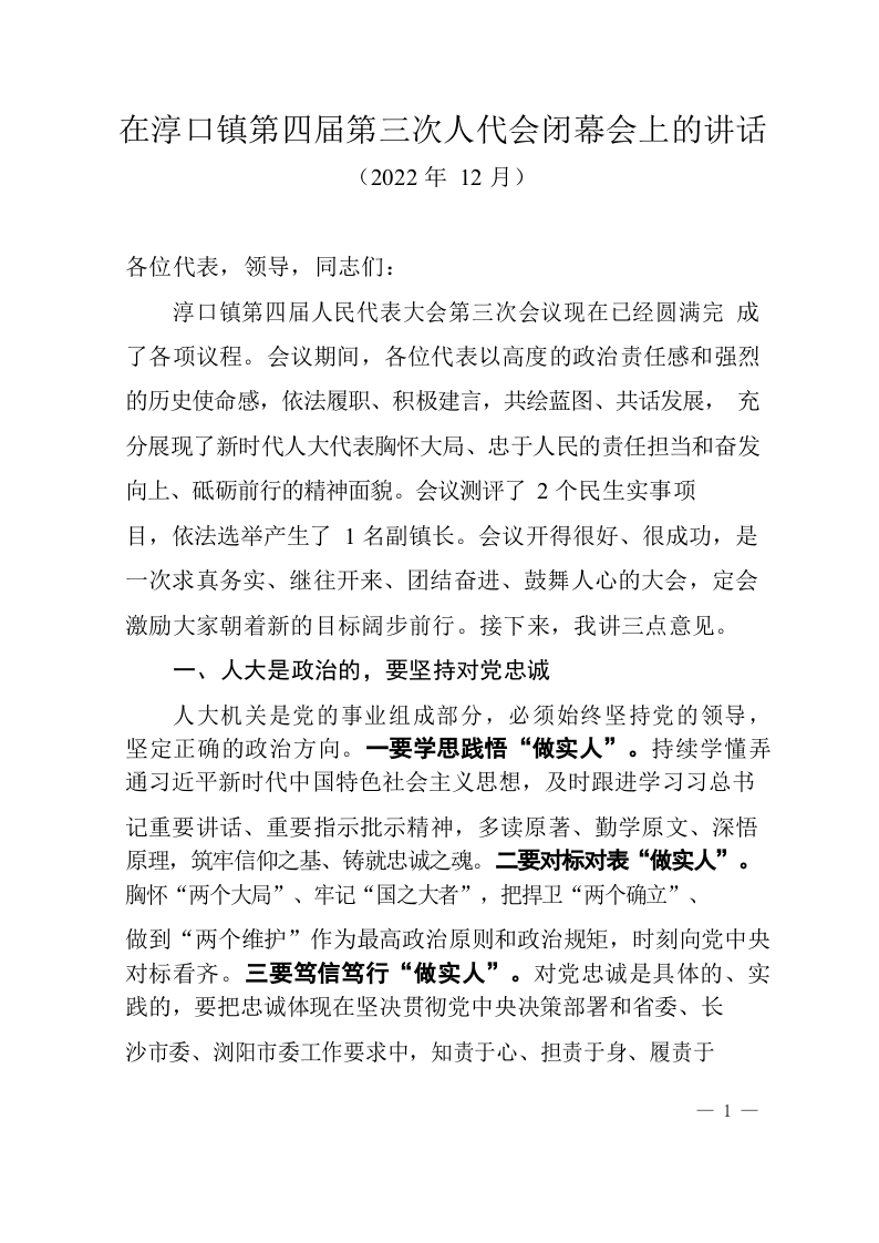 (书记)在第四届第三次人代会闭幕会上的讲话-2022年12月