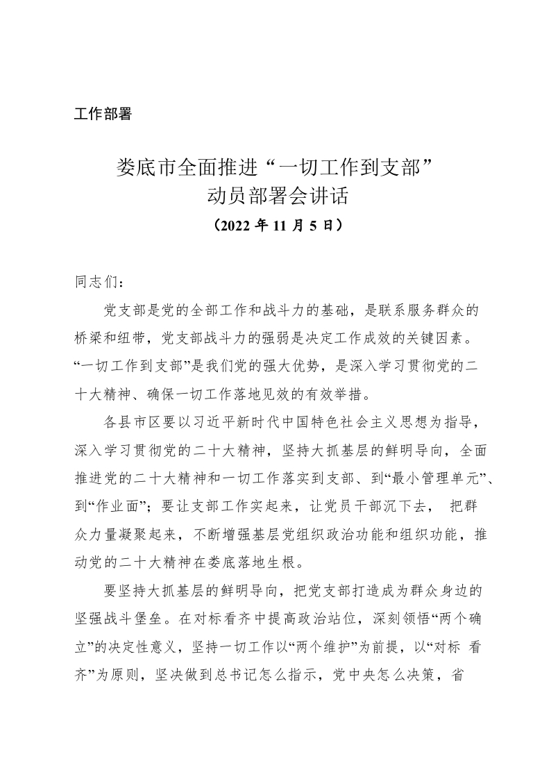 / (工作部署)XX市全面推进“一切工作到支部”动员部署会讲话
