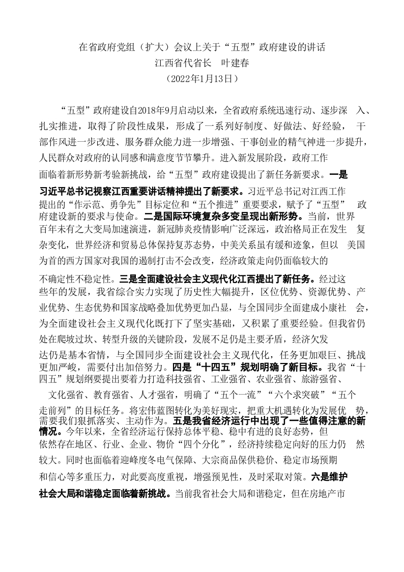 / (江西省)代省长叶建春在省政府党组(扩大)会议上关于“五型”政府建设的讲话
