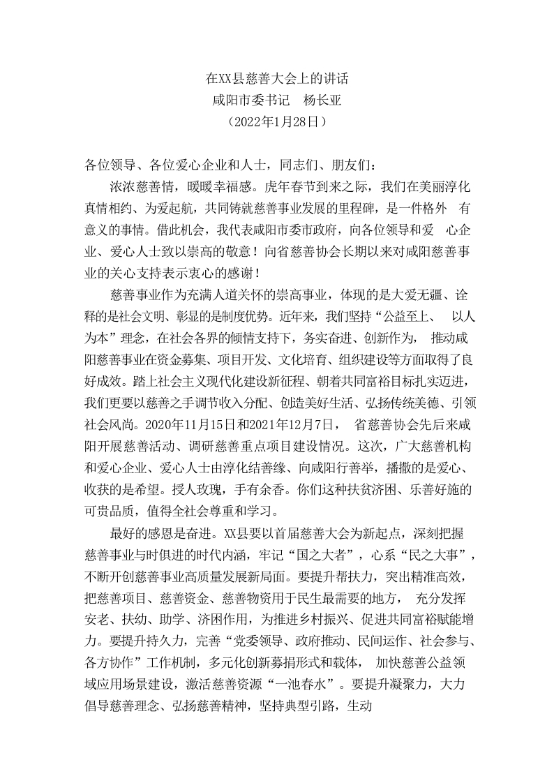 (陕西省x市)市委书记在X县慈善大会上的讲话