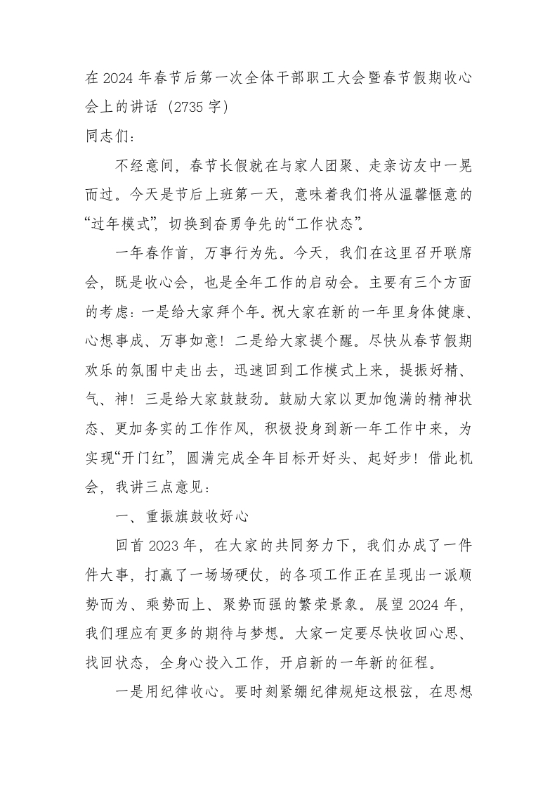 / 在2024年春节后第一次全体干部职工大会暨春节假期收心会上的讲话