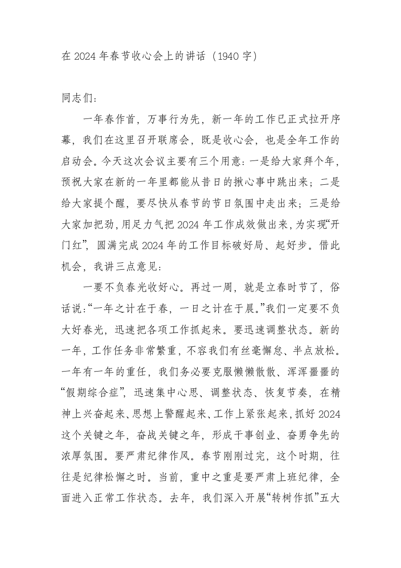 在2024年春节后第一次全体干部职工大会暨春节假期收心会上的讲话