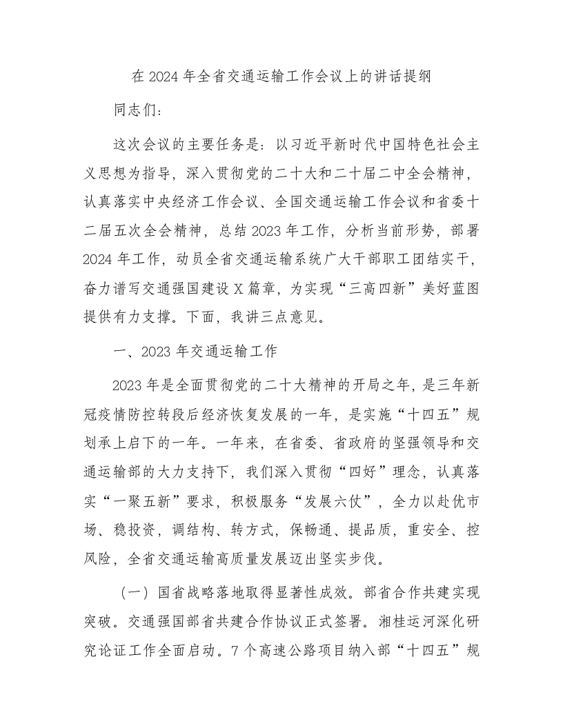 / 在2024年全省交通运输工作会议上的讲话提纲