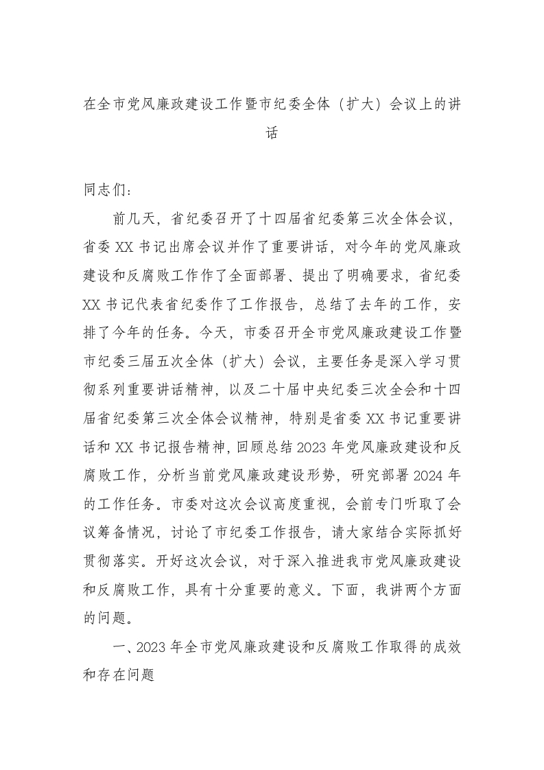 / 在全市党风廉政建设工作暨市纪委全体(扩大)会议上的讲话