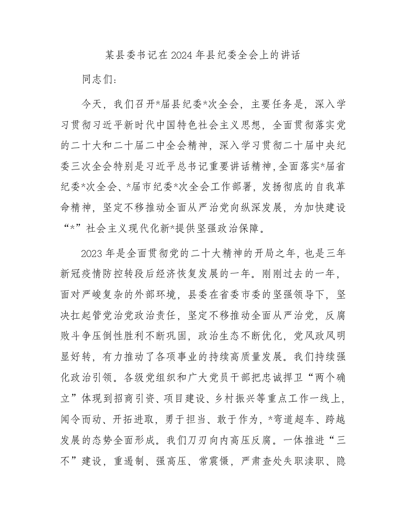 / 某县委书记在2024年县纪委全会上的讲话