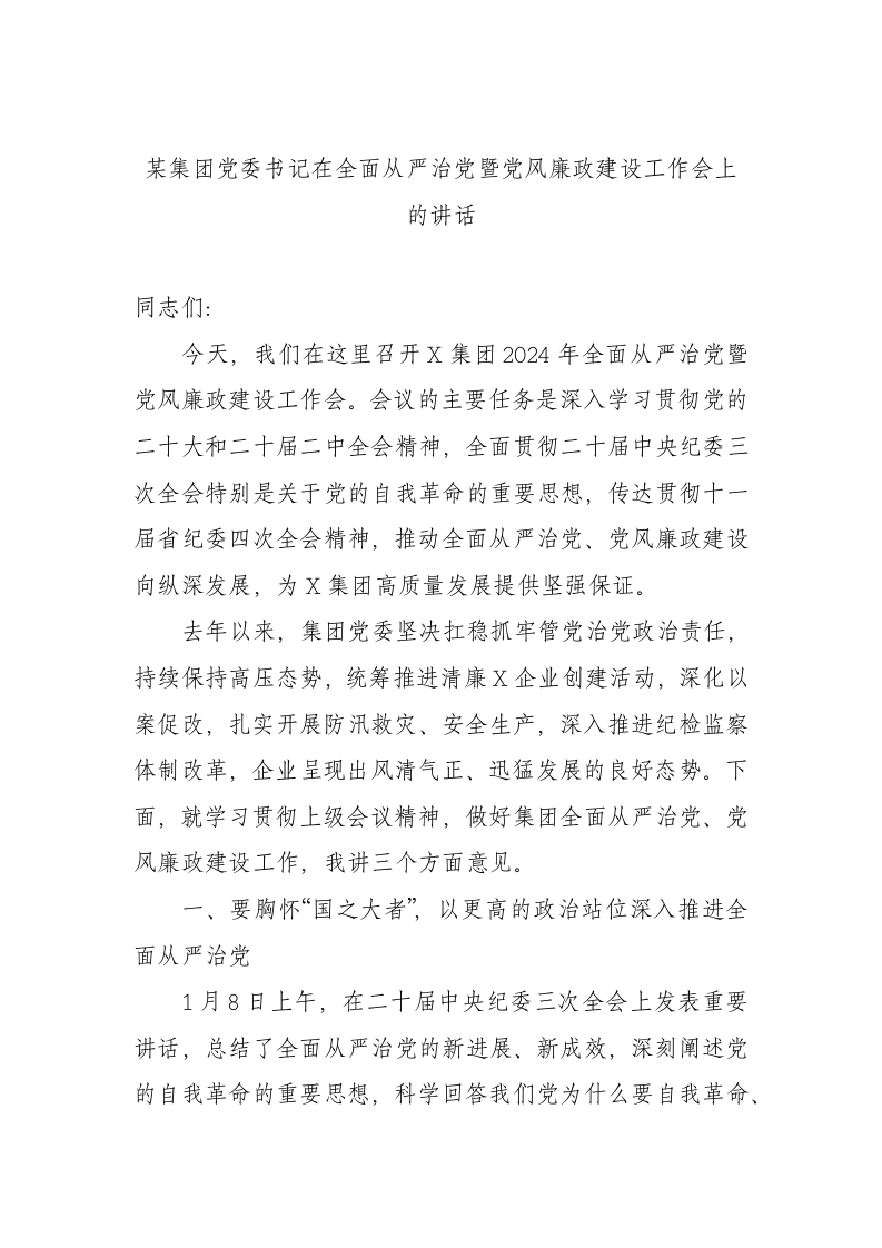 / 某集团党委书记在全面从严治党暨党风廉政建设工作会上的讲话