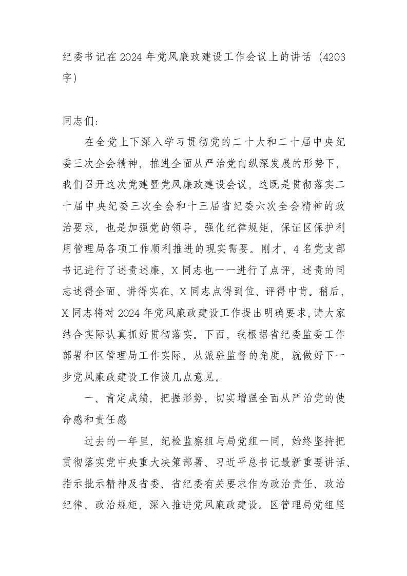 / 纪委书记在2024年党风廉政建设工作会议上的讲话