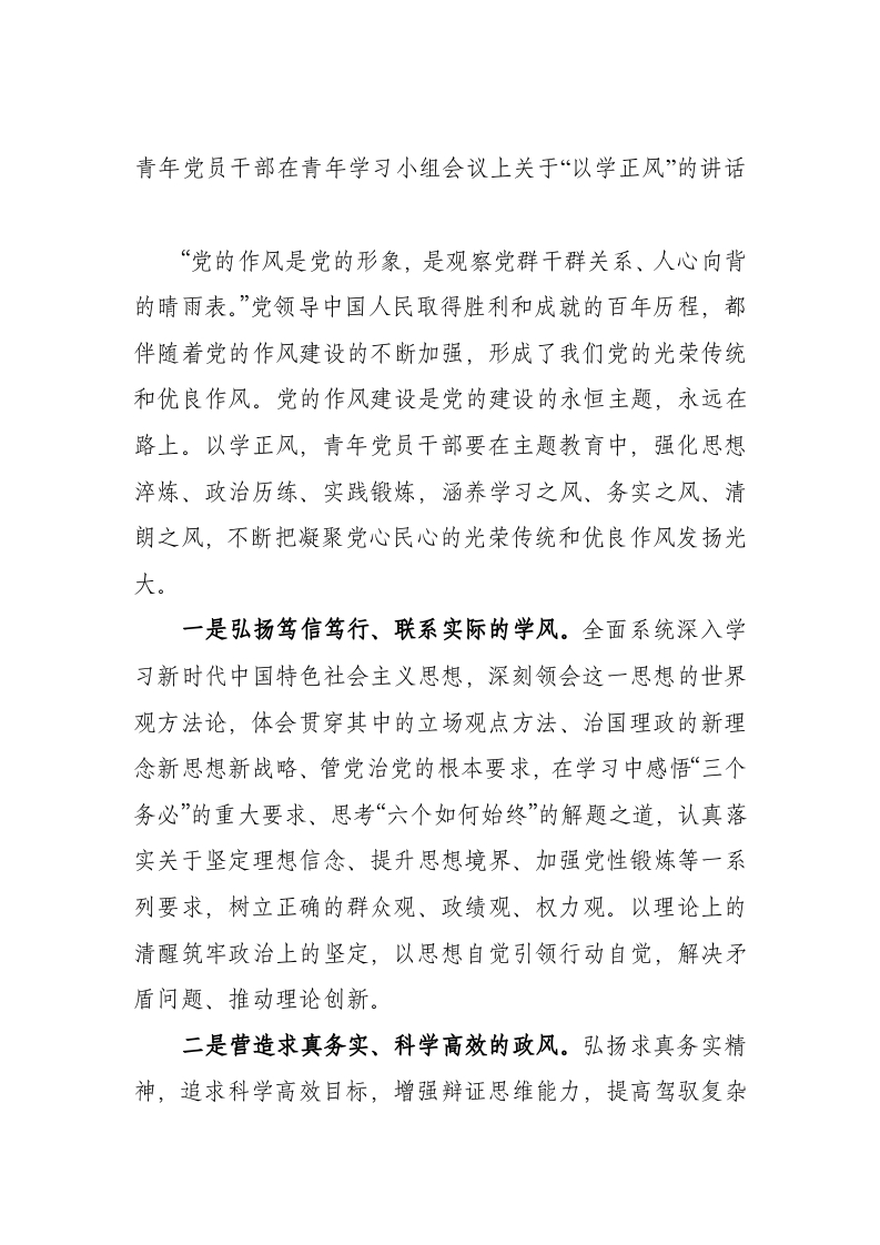 / 青年党员干部在青年学习小组会议上关于“以学正风”的讲话