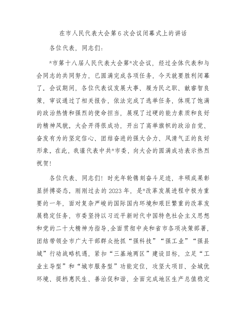 / 在市人民代表大会第6次会议闭幕式上的讲话
