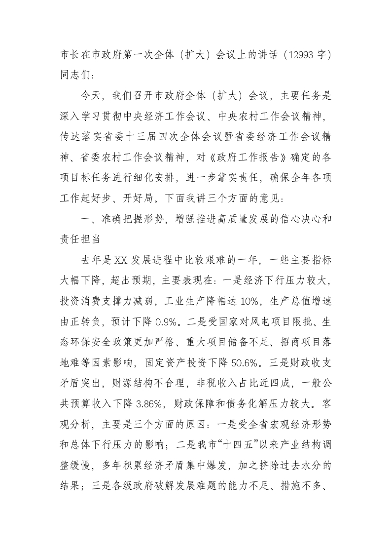 市长在市政府第一次全体(扩大)会议上的讲话