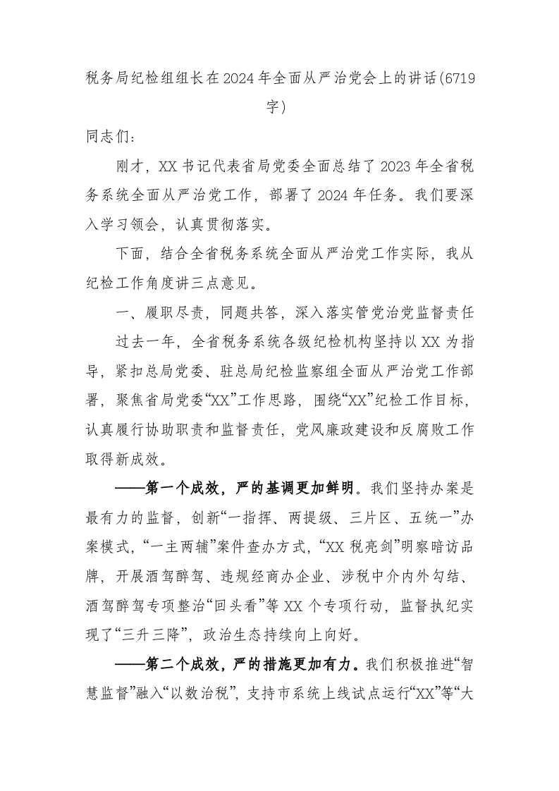 / 税务局纪检组组长在2024年全面从严治党会上的讲话