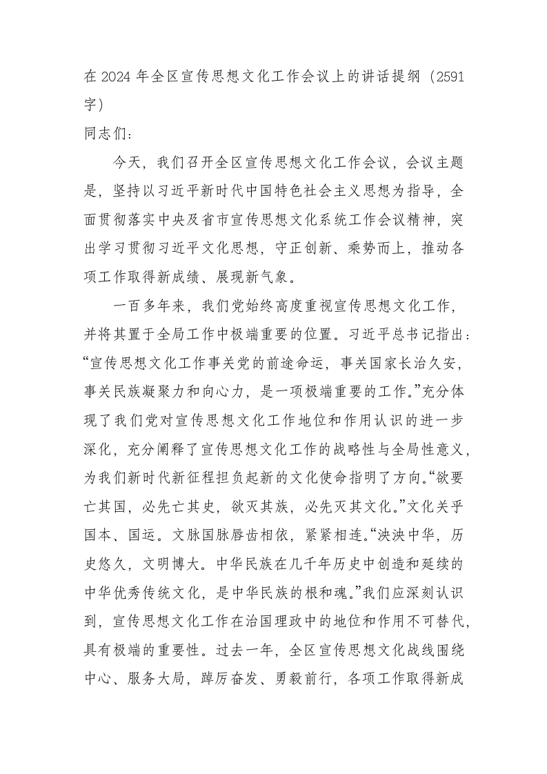 / 在2024年全区宣传思想文化工作会议上的讲话提纲