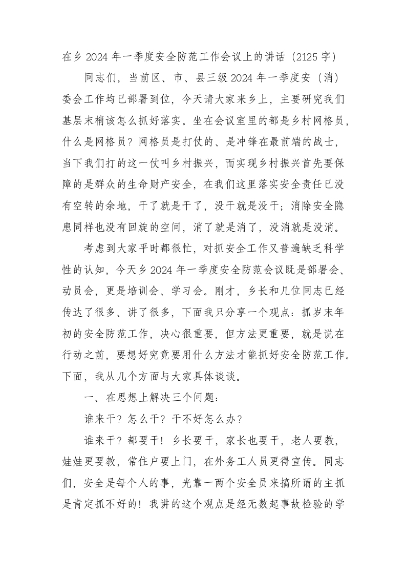 / 在乡2024年一季度安全防范工作会议上的讲话