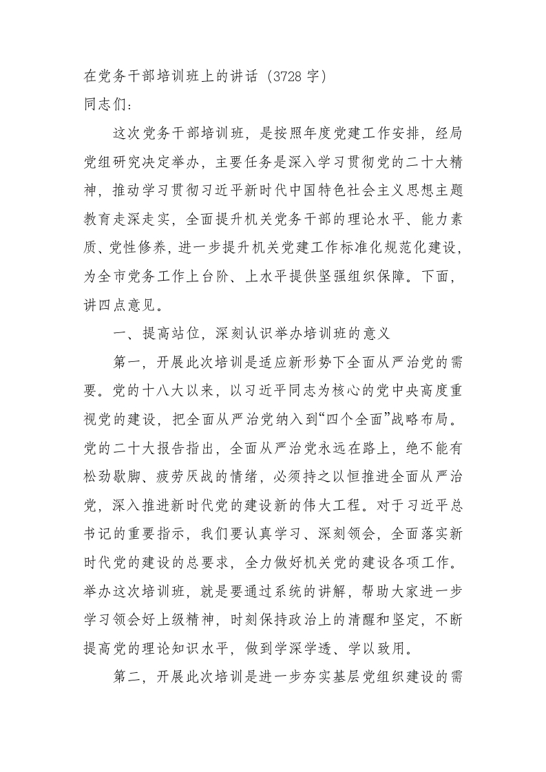 在党务干部培训班上的讲话