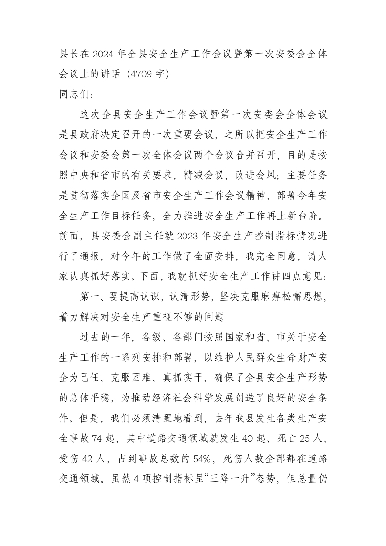 / 县长在2024年全县安全生产工作会议暨第一次安委会全体会议上的讲话