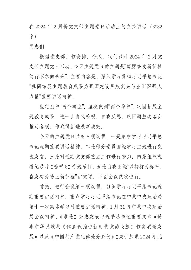 / 在2024年2月份党支部主题党日活动上的主持讲话
