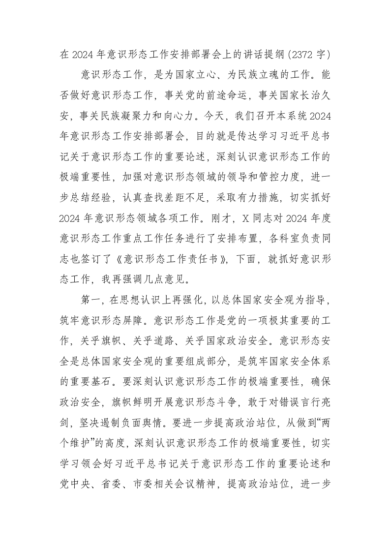 / 在2024年意识形态工作安排部署会上的讲话提纲