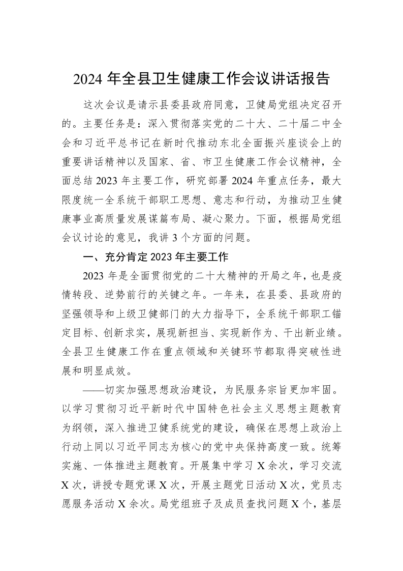 / 2024年全县卫生健康工作会议讲话稿报告
