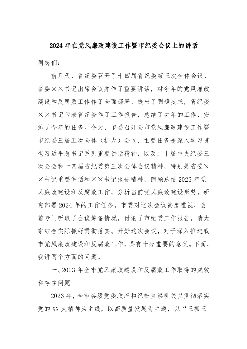 / 2024年在党风廉政建设工作暨市纪委会议上的讲话稿