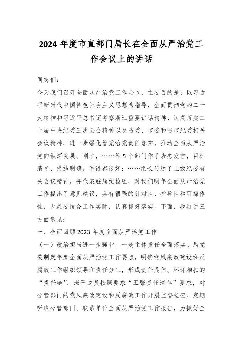 / 2024年度市直部门局长在全面从严治党工作会议上的讲话稿