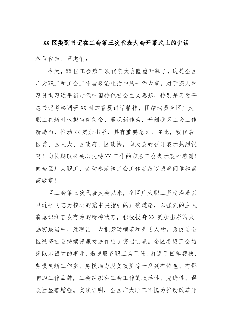 / XX区委副书记在工会第三次代表大会开幕式上的讲话稿