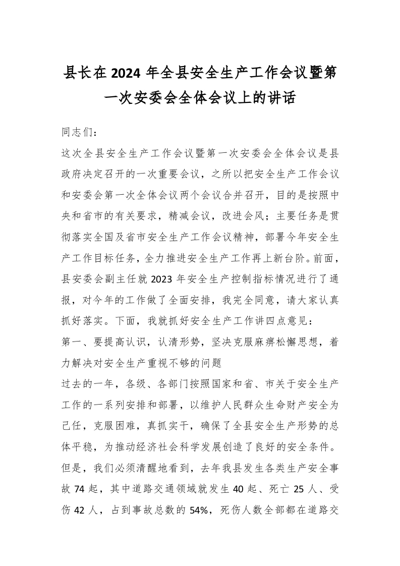 / 县长在2024年全县安全生产工作会议暨第一次安委会全体会议上的讲话稿