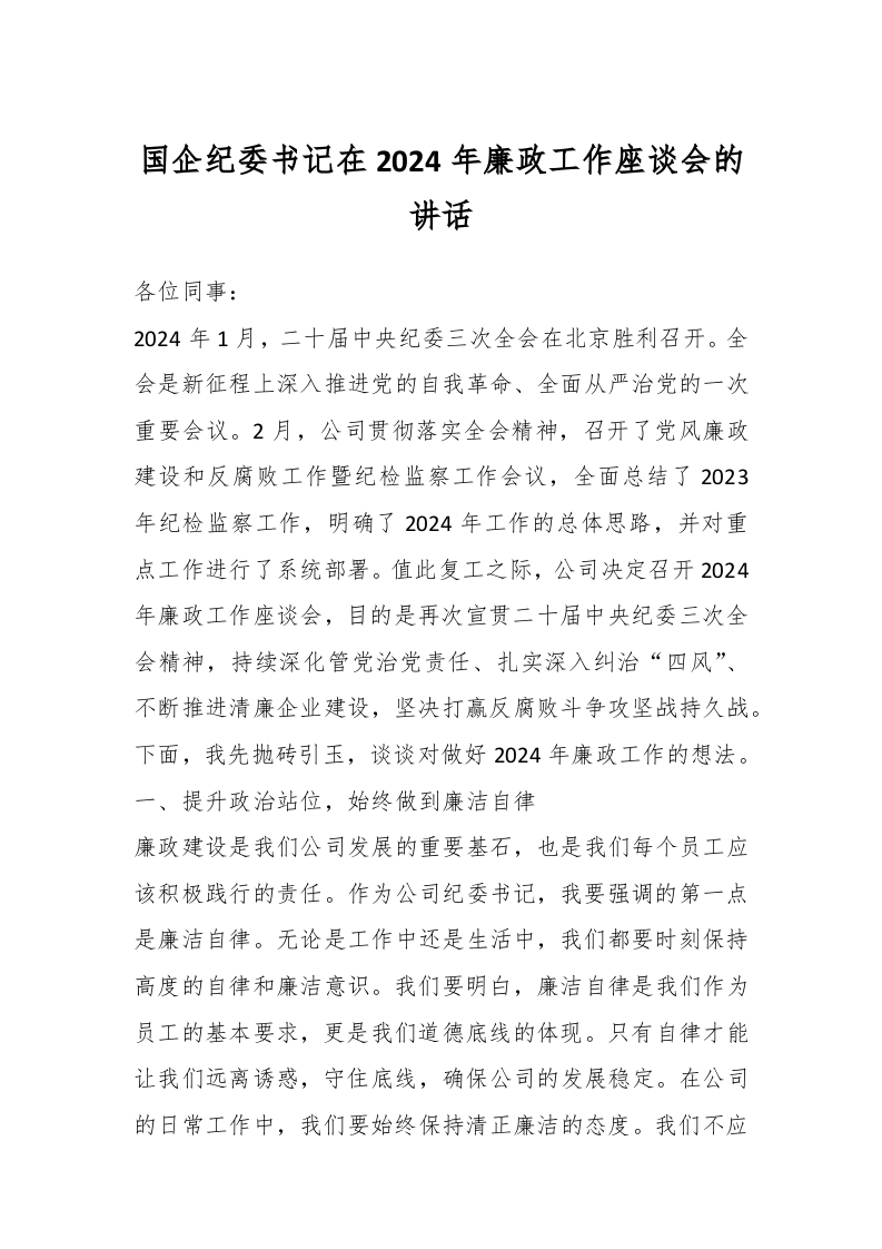 国企纪委书记在2024年廉政工作座谈会的讲话稿