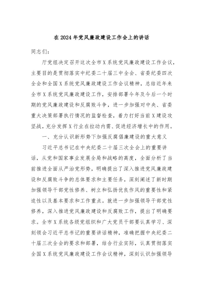 / 在2024年党风廉政建设工作会上的讲话稿