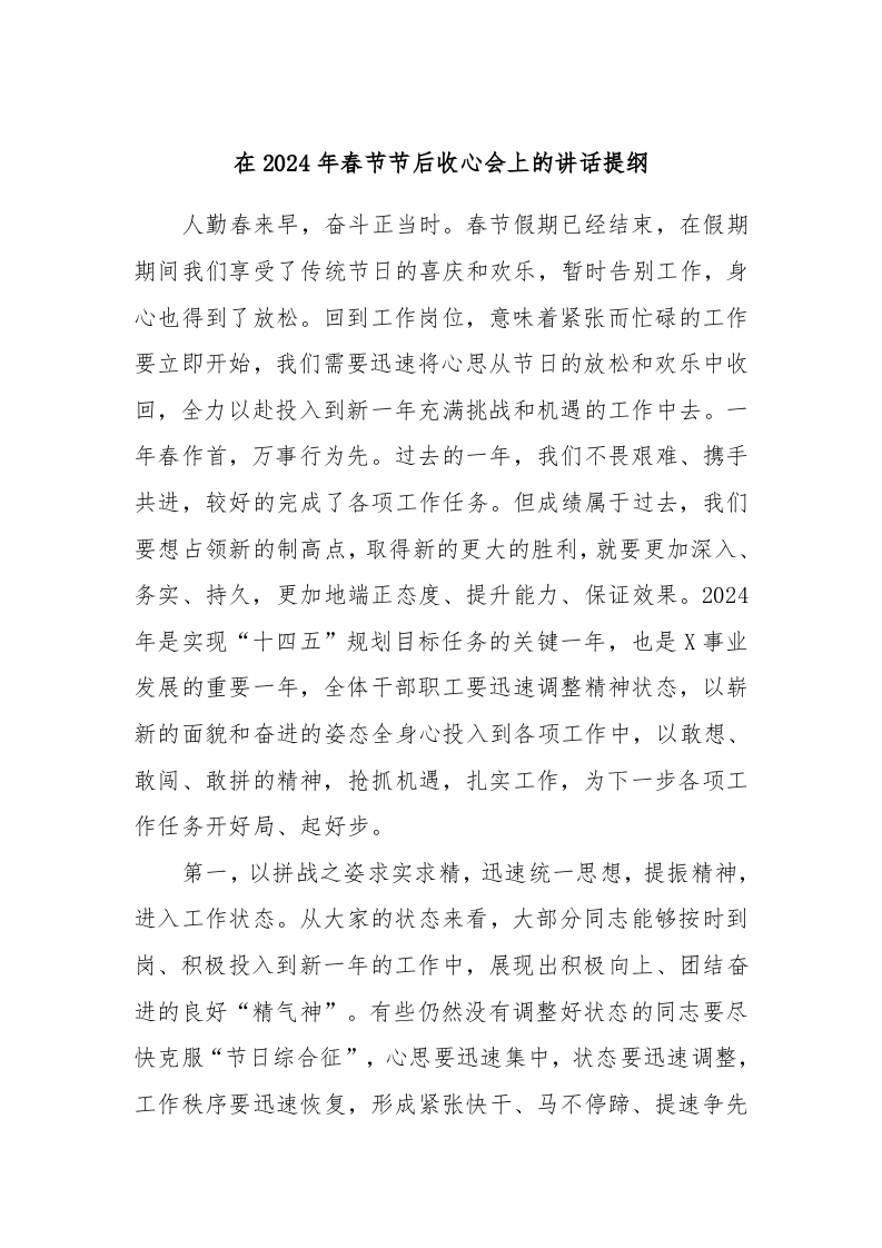 / 在2024年春节节后收心会上的讲话稿提纲