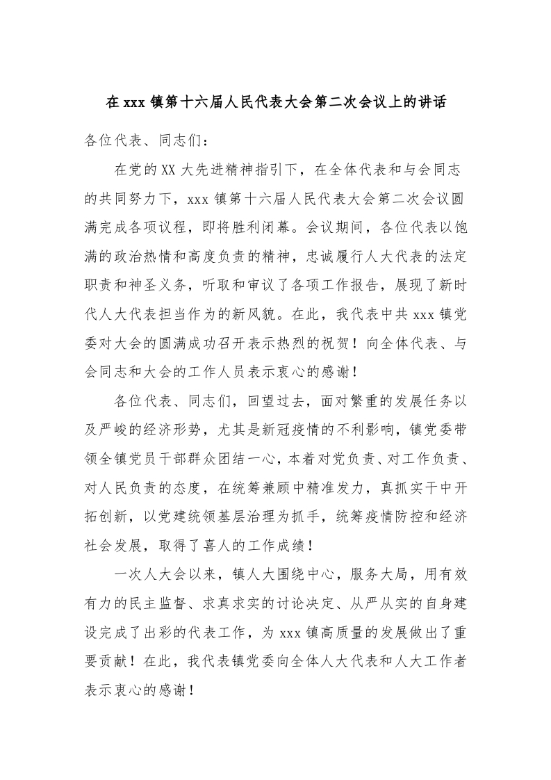 / 在xxx镇第十六届人民代表大会第二次会议上的讲话稿
