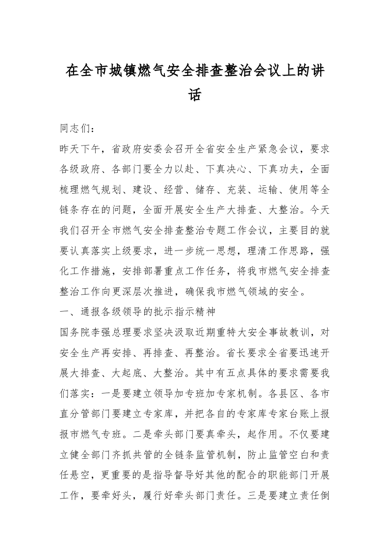 / 在全市城镇燃气安全排查整治会议上的讲话稿