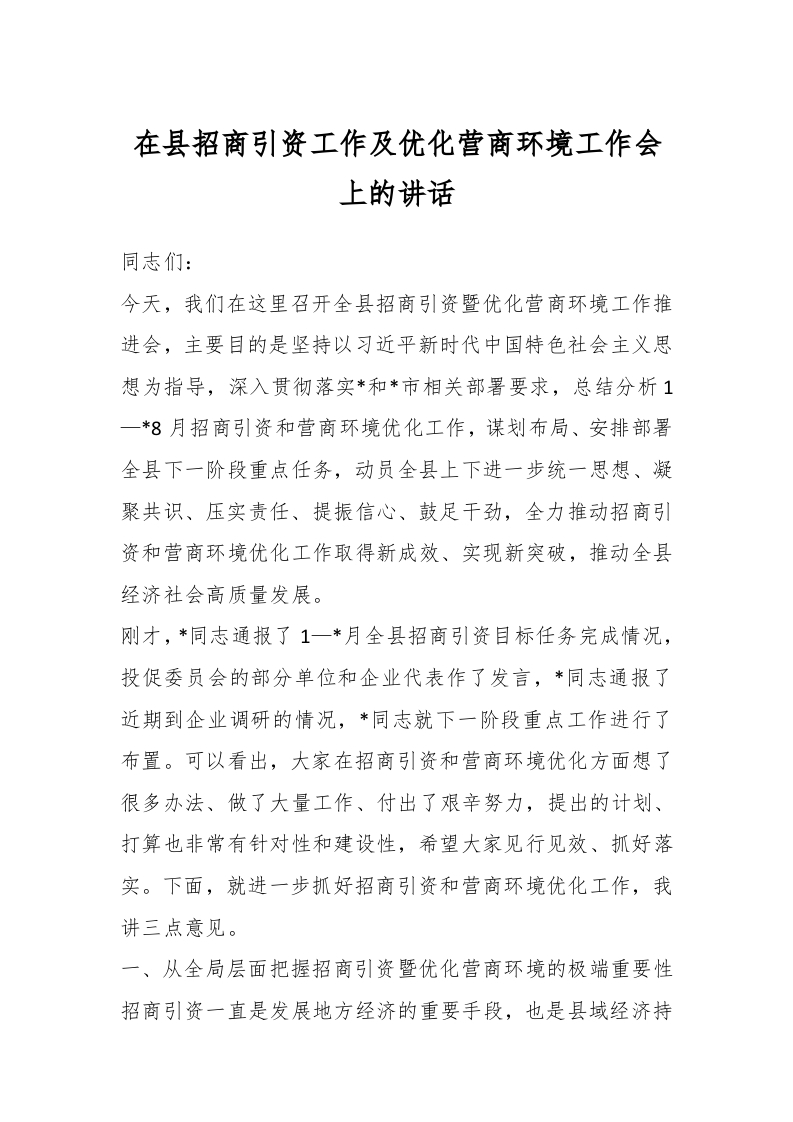 / 在县招商引资工作及优化营商环境工作会上的讲话稿