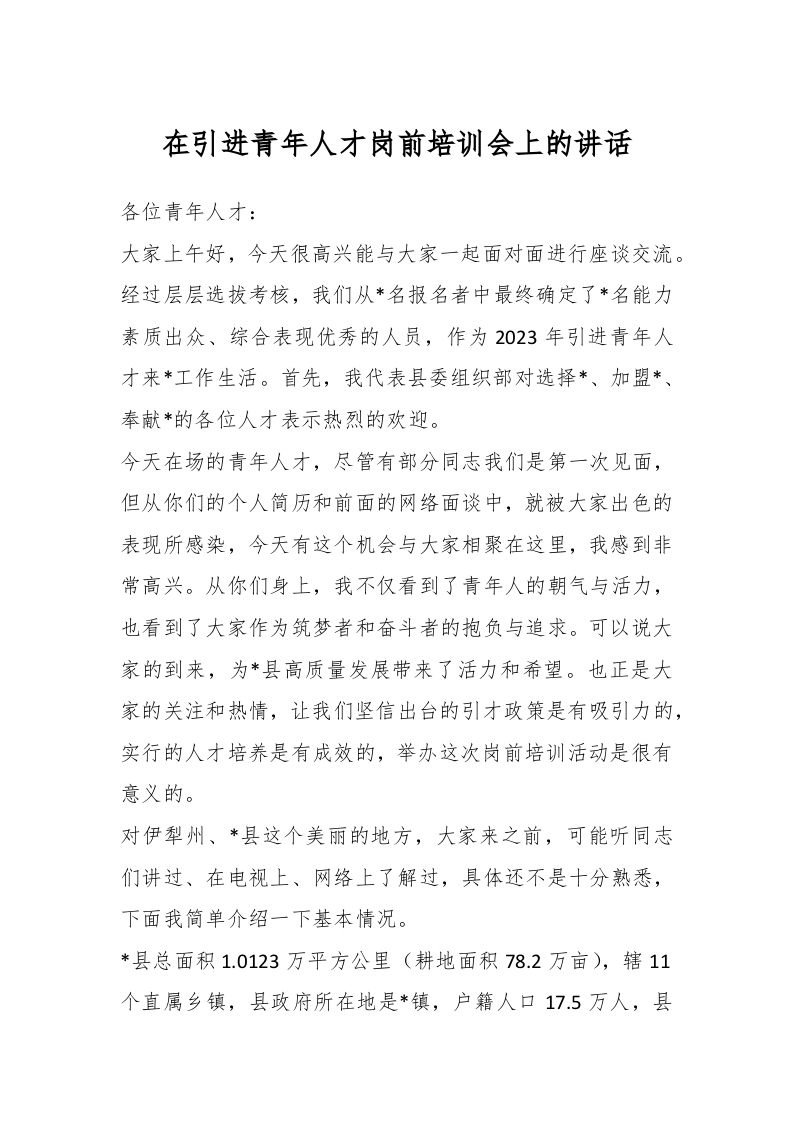 / 在引进青年人才岗前培训会上的讲话稿
