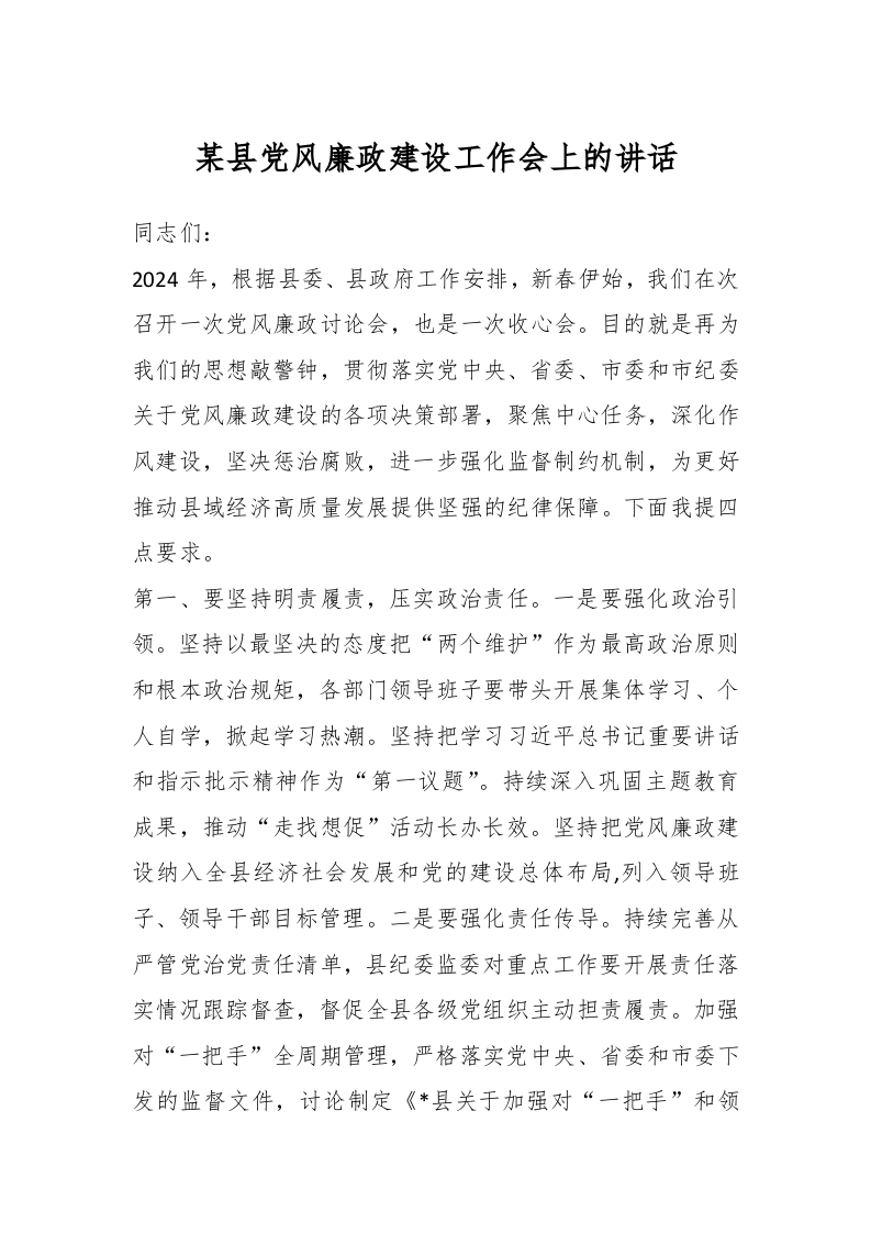 / 某县党风廉政建设工作会上的讲话稿