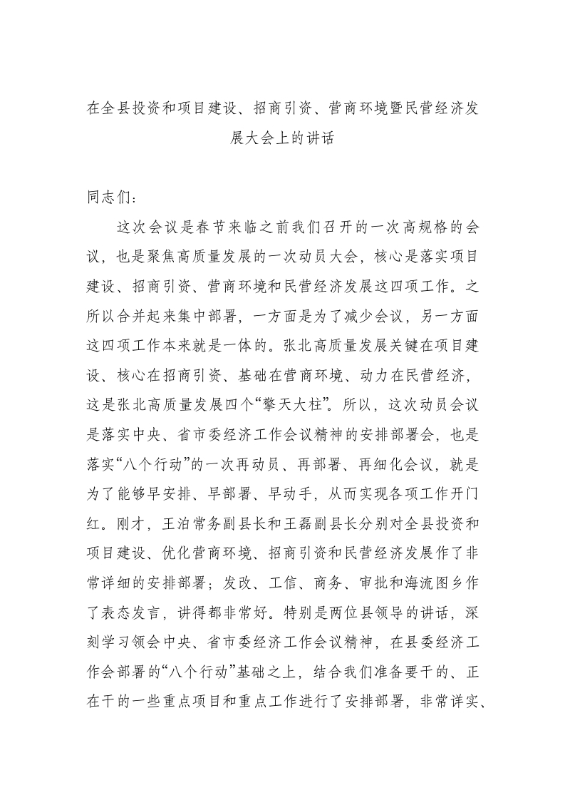 / 在全县投资和项目建设、招商引资、营商环境暨民营经济发展大会上的讲话