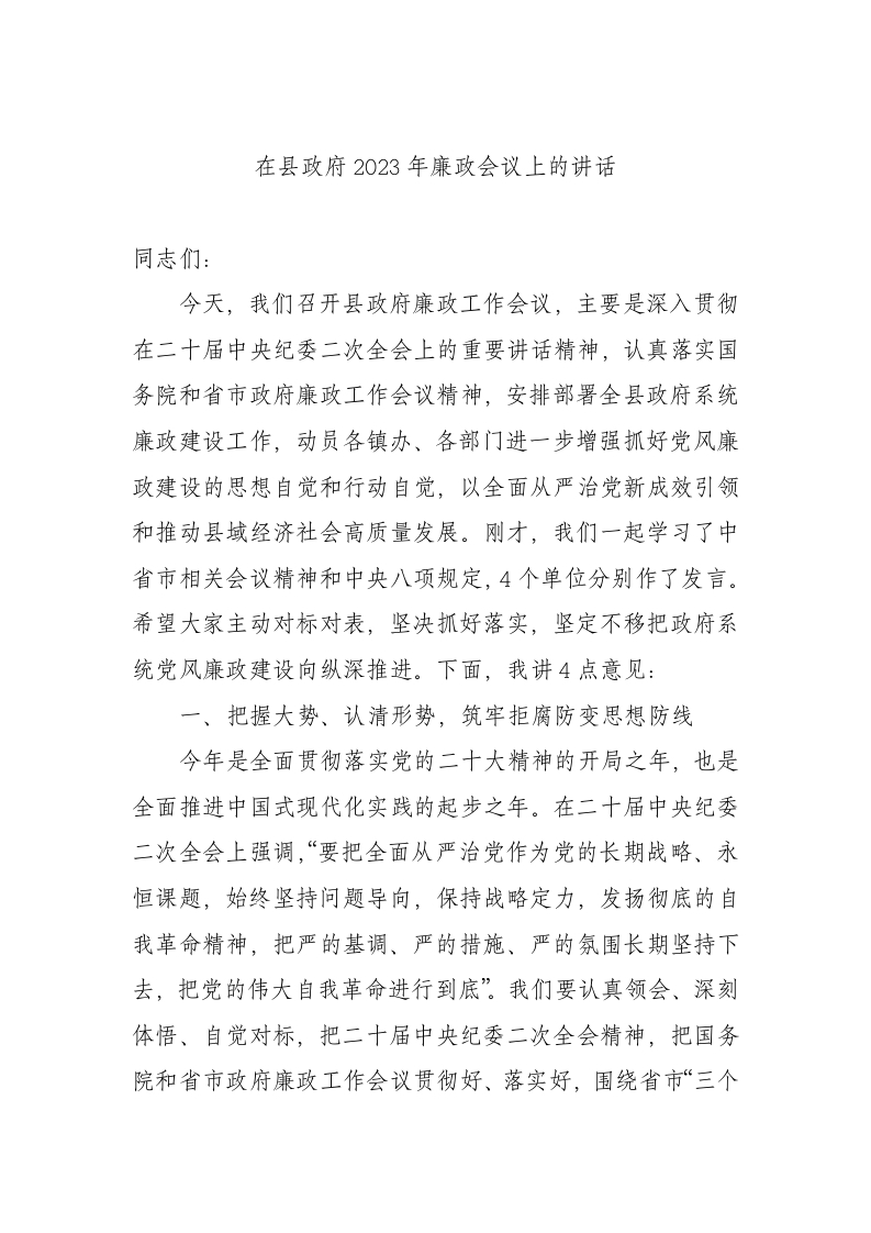 / 在县政府2023年廉政会议上的讲话
