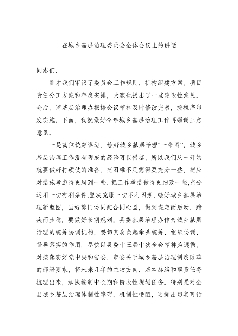 / 在城乡基层治理委员会全体会议上的讲话