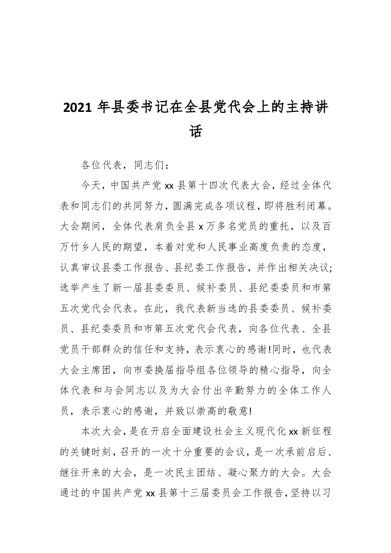 / 2021年县委书记在全县党代会上的主持讲话稿