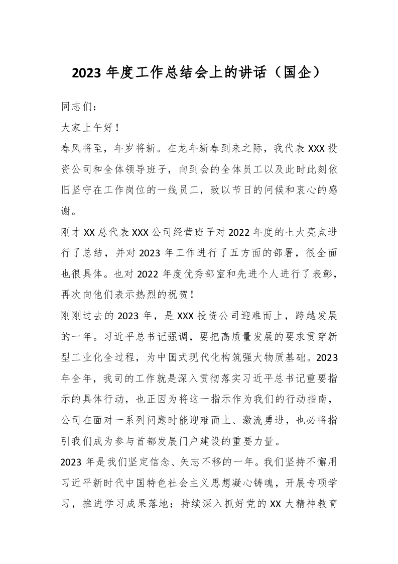/ 2023年度工作总结会上的讲话稿(国企)